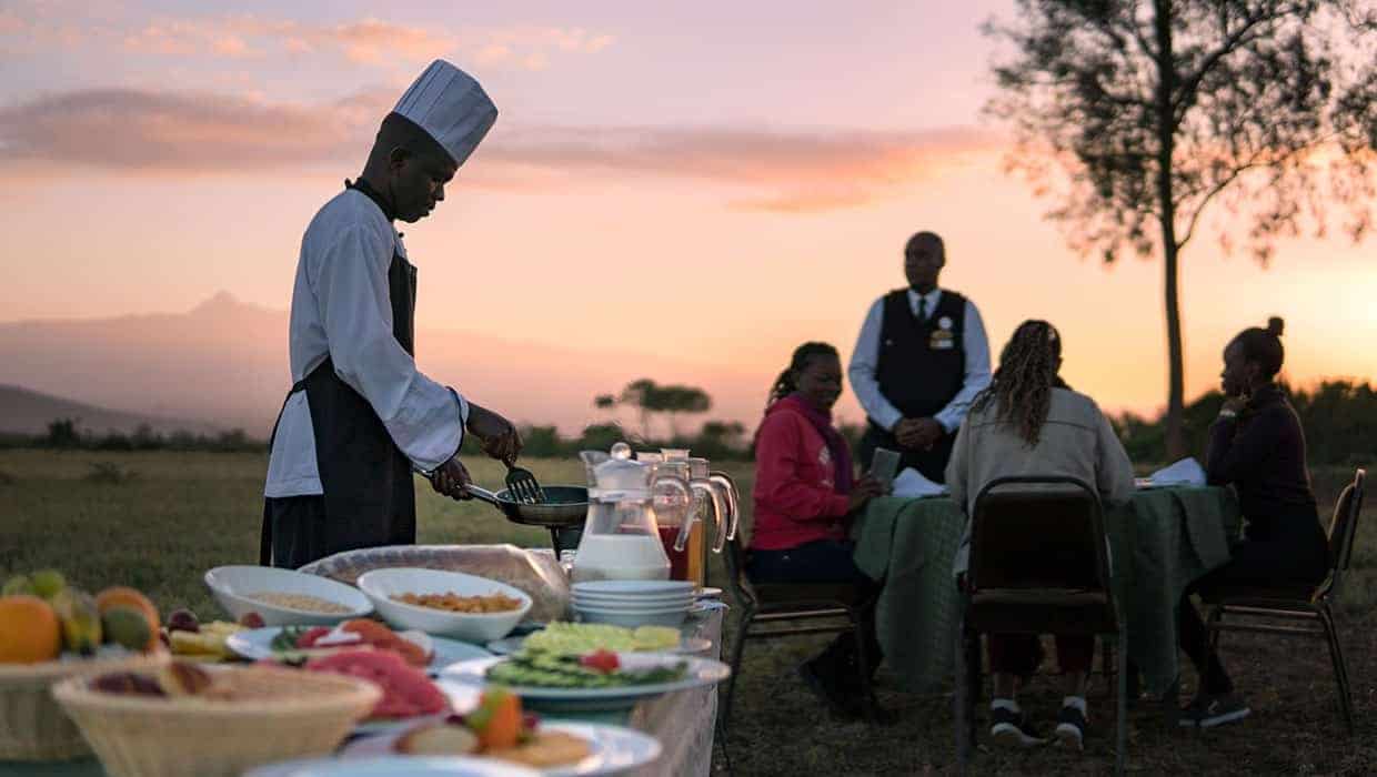 Départ de votre lodge au lever du soleil pour aller prendre votre petit-déjeuner en brousse. Une expérience extraordinaire à vivre au moins une fois dans sa vie. Quoi de plus beau que de partager ce moment insolite dans la nature en couple, entre amis ou en famille !