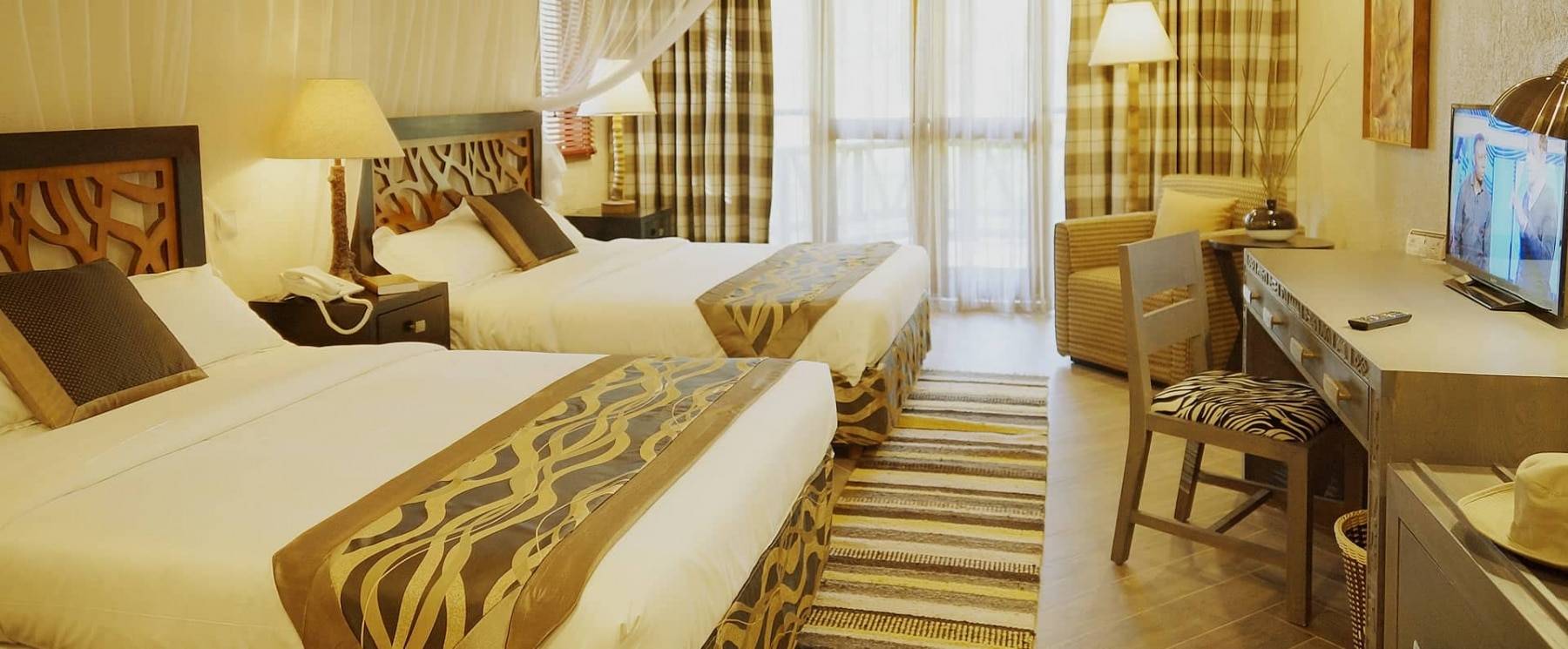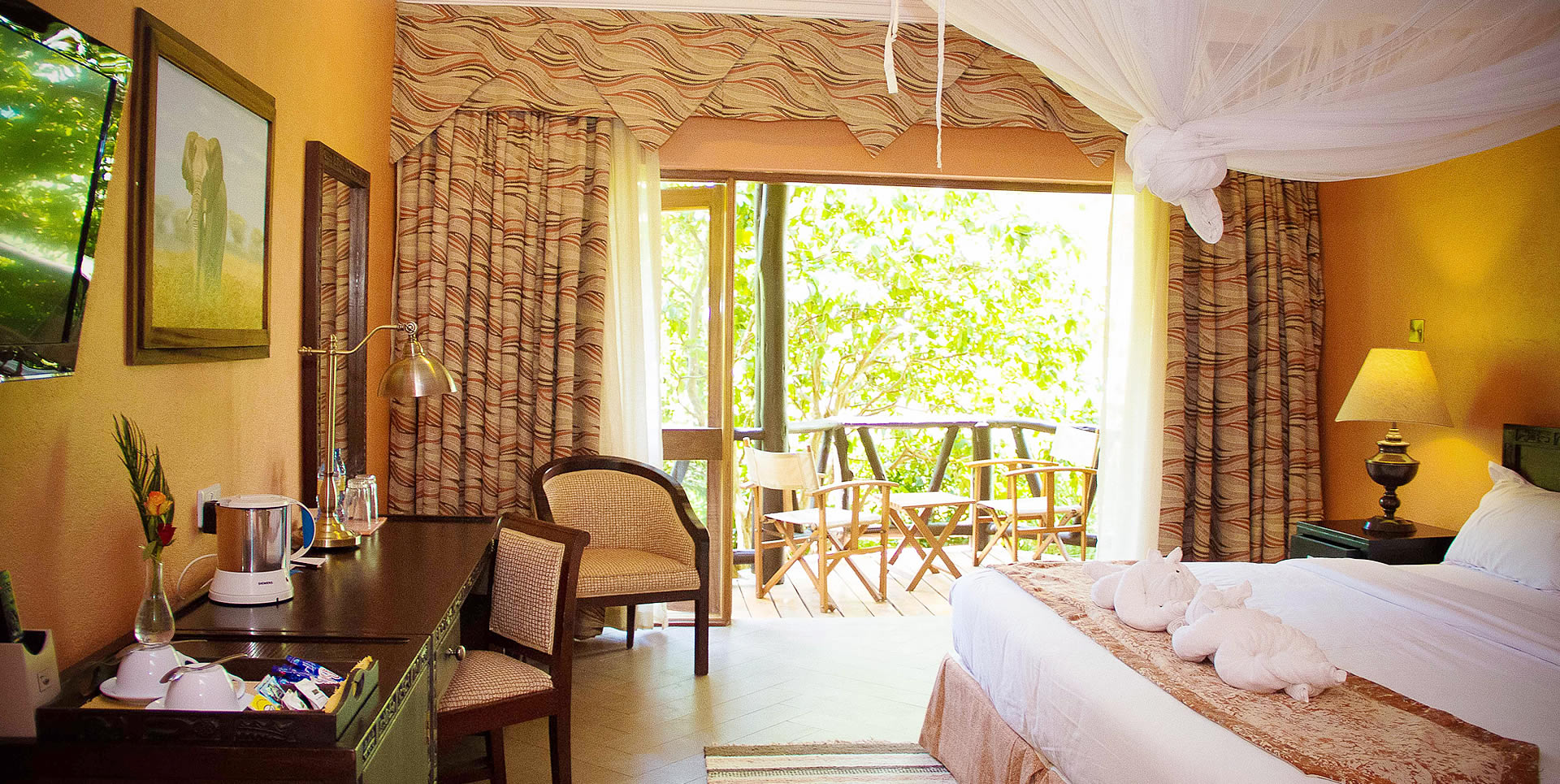 L’hôtel est composé de 48 chambres dotées d’un grand lit avec une moustiquaire, d’une salle de bain équipée, d’un coin bureau avec un grand miroir, d’une télévision ainsi que d’une connexion internet. De plus, toutes les chambres ont un balcon. Ces balcons sont aménagés avec une table et des sièges confortables qui en font un endroit parfait pour se détendre et observer les nombreuses espèces d’oiseaux qui se trouvent dans cette région. Le lodge dispose également d’une suite de luxe avec baignoire et cuisine tout équipée avec un réfrigérateur.