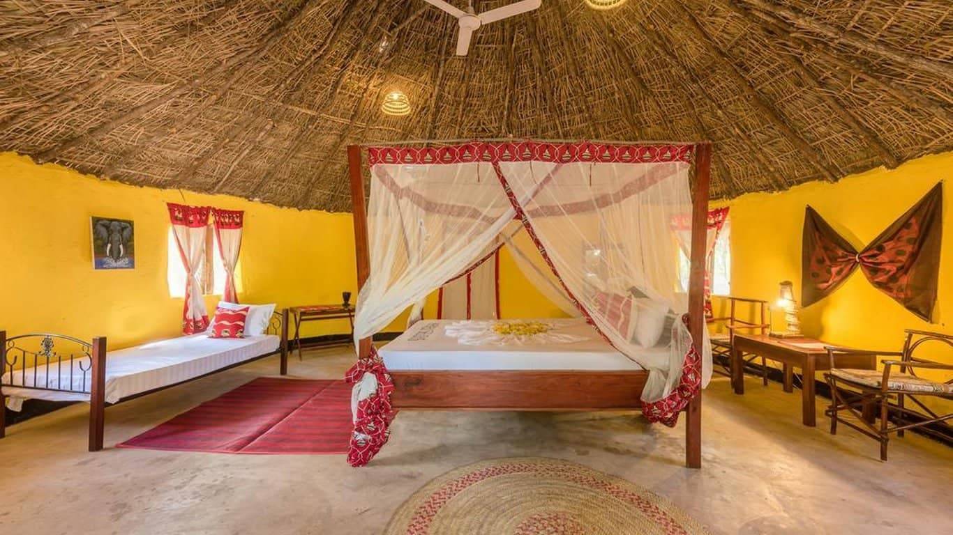 Le camp propose différents types d’hébergements : 6 bungalows safari de luxe et 16 cabanes traditionnelles Banda.