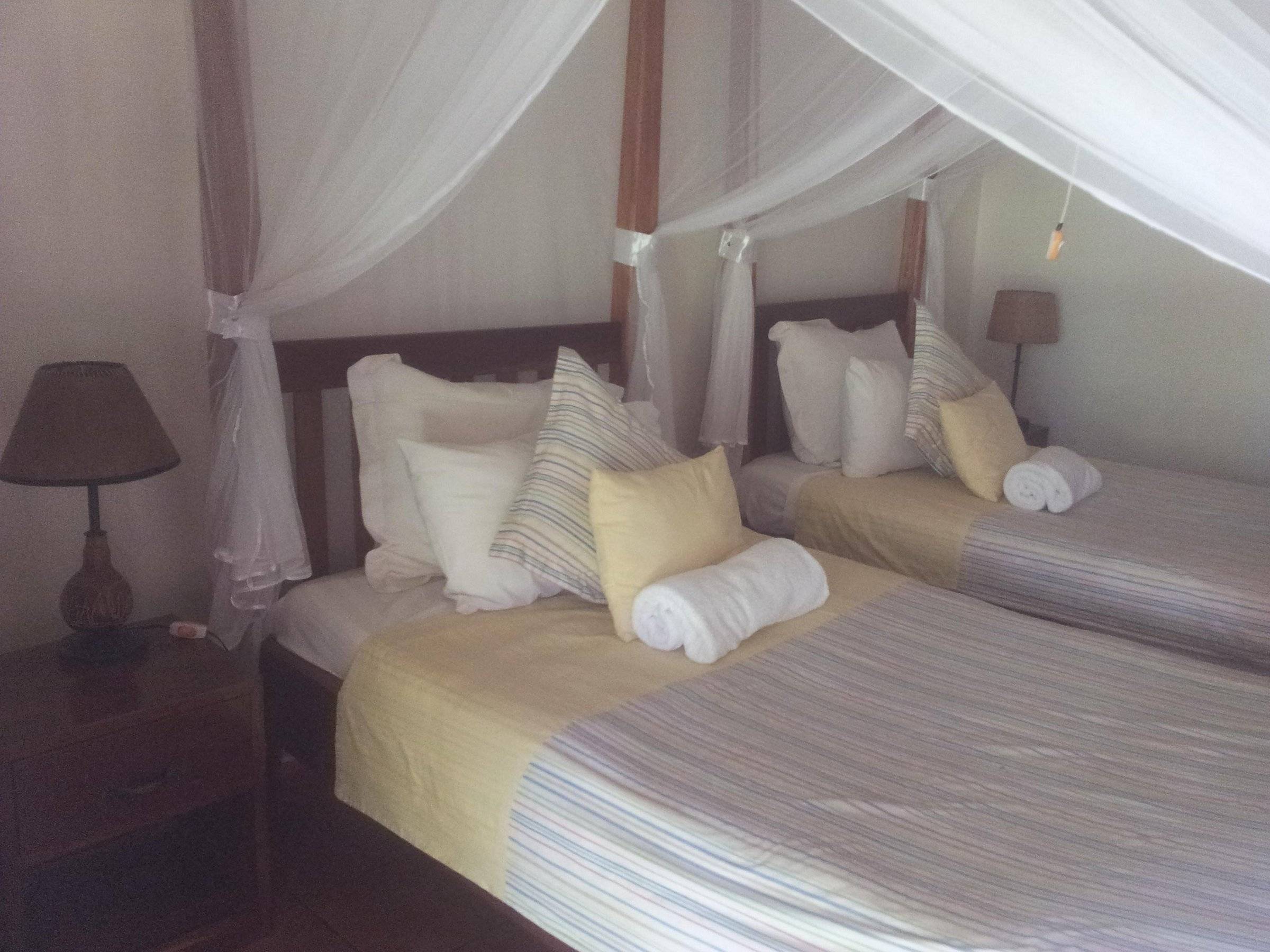 Elles sont équipées d’un ventilateur de plafond, de lits doubles ou simples avec moustiquaire, d’un bureau et de confortables chaises de patio.