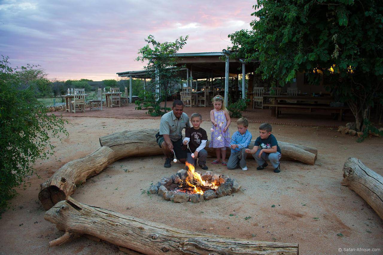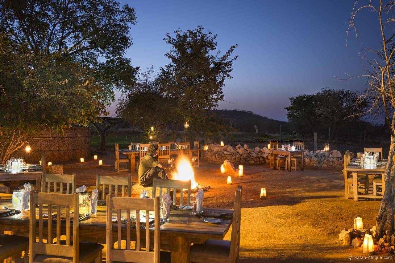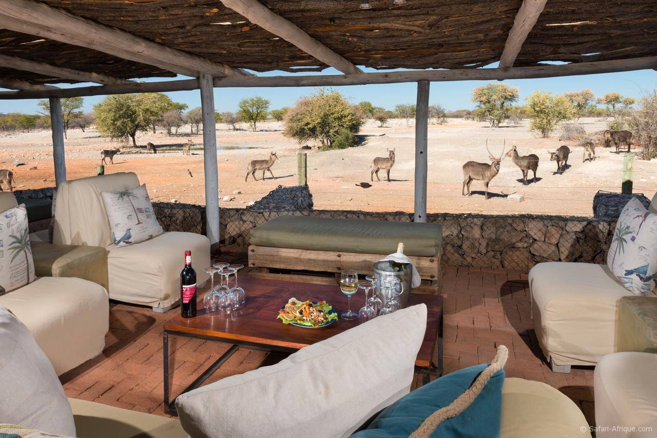 Le camp permet d’observer la faune directement depuis le point d’eau, avec de fortes chances d’apercevoir les rhinocéros résidents.