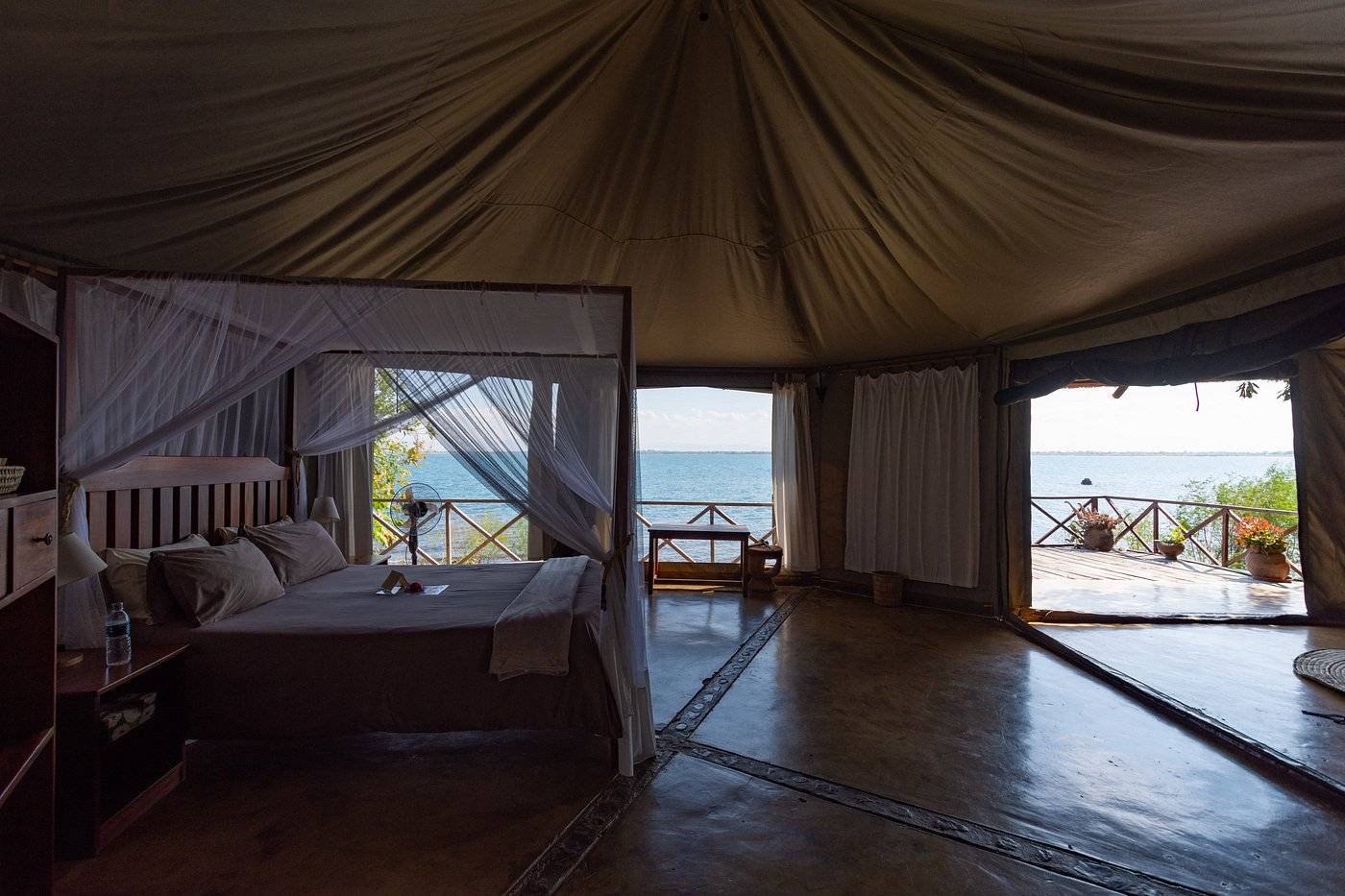 Vous pouvez choisir entre des chalets isolés sur les rives de l’île ou des tentes de safari situées plus près des installations principales.