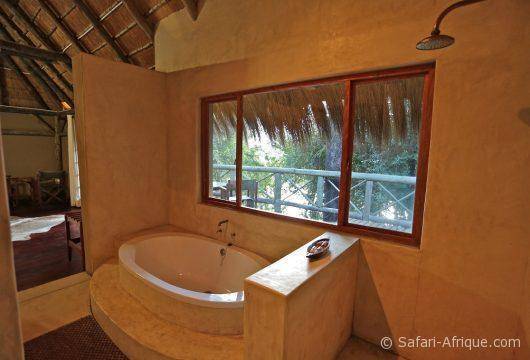 Le lodge propose également des cabanes dans les arbres (4), équipées d’une salle de bain avec douche et baignoire, d’une moustiquaire, d’un coffre-fort, d’un ventilateur et d’une terrasse privée avec vue sur la rivière Kwando.