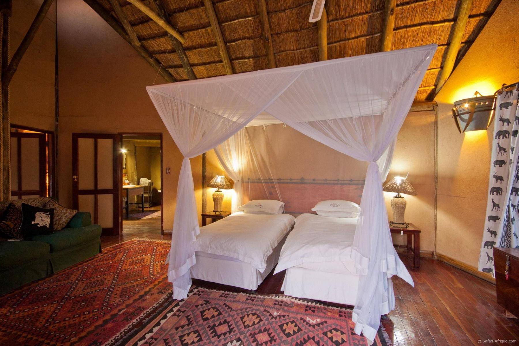 Situé dans une concession privée à la frontière de la Réserve naturelle du Central Kalahari, à proximité du delta de l’Okavango.