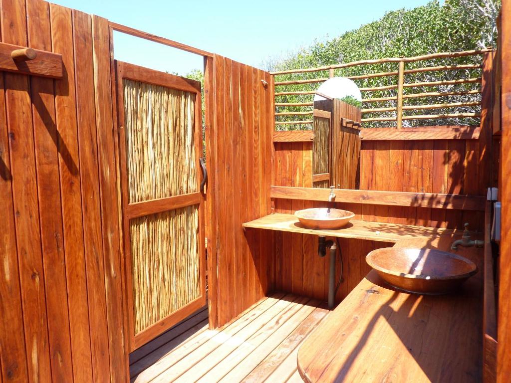 Chaque bungalow comprend une salle de bain avec baignoire et double vasque, des toilettes séparées ainsi qu’une douche extérieure.