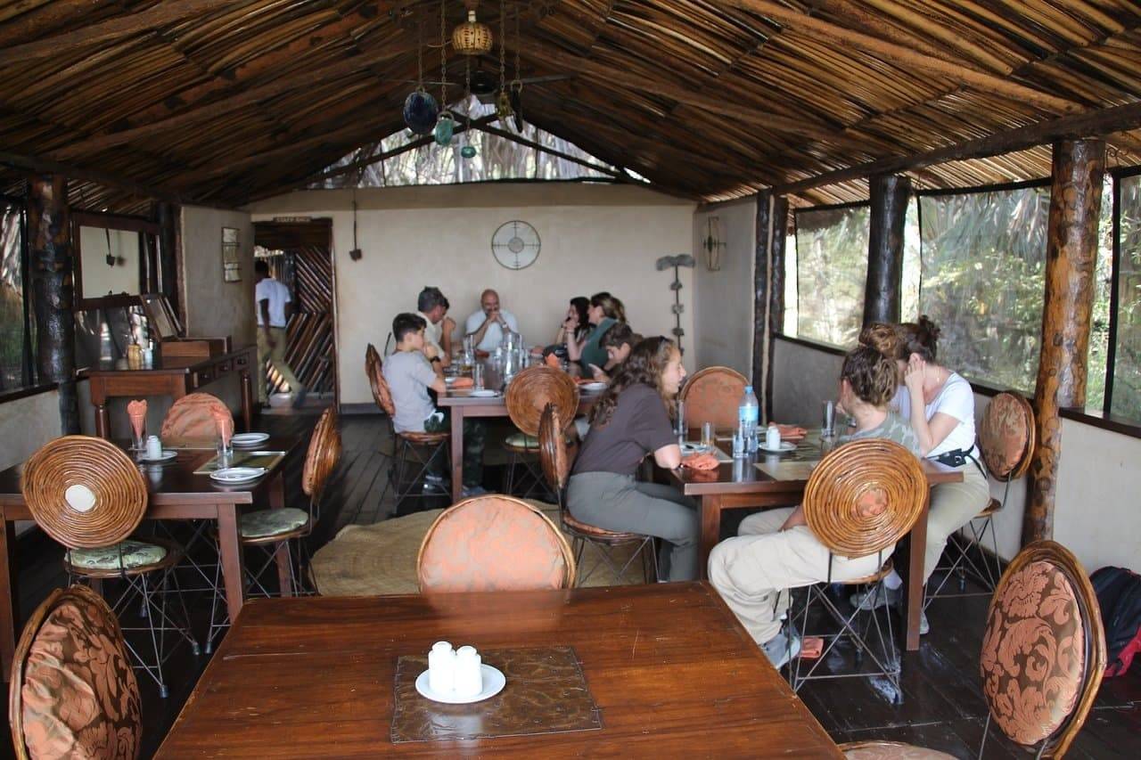 Les repas sont préparés à partir de produits locaux et servis dans un restaurant avec vue sur le lac.