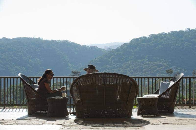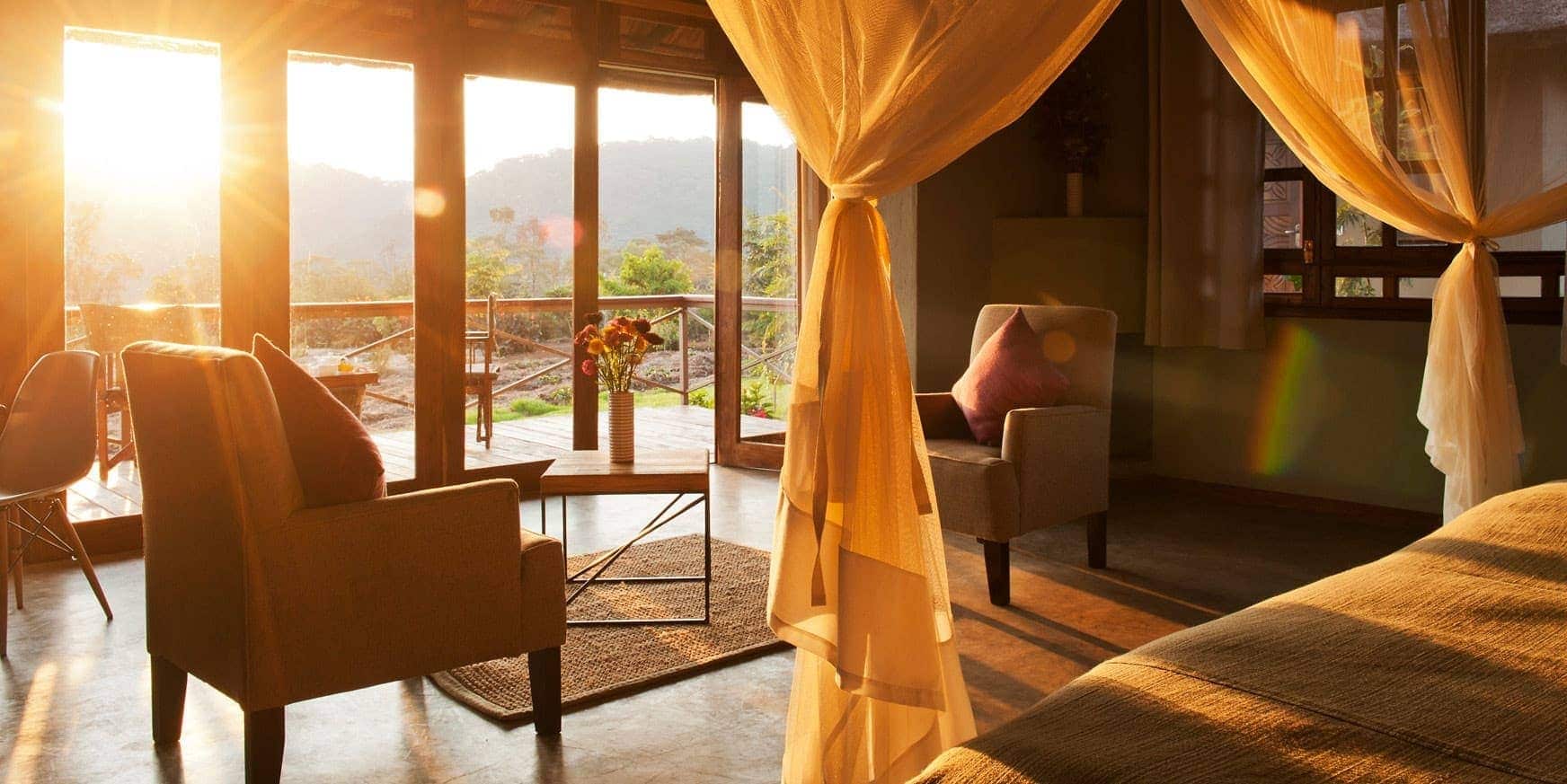 Perché sur le flanc d’une vallée, il offre une vue spectaculaire sur une plantation de café et une chute d’eau.