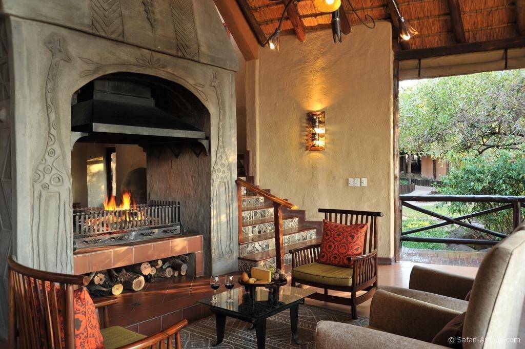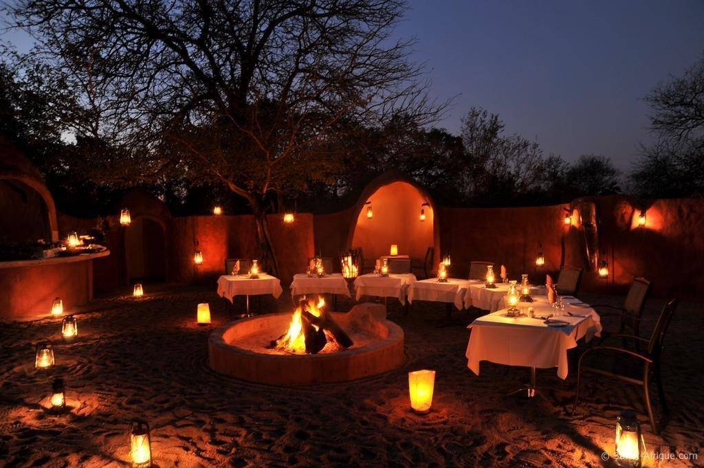 Le lodge propose plusieurs espaces de restauration : boma africain, salle à manger, salon et bar avec cave à vins.
