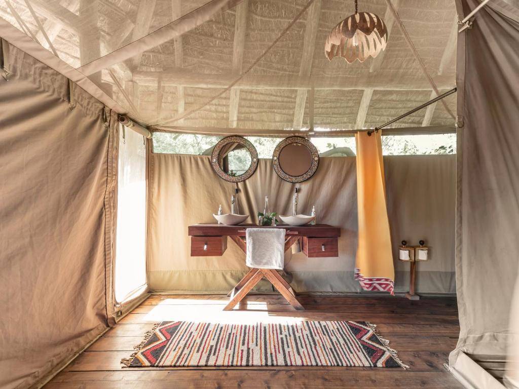 Composé de tentes élégantes nichées sous des toits de chaume, il offre une immersion totale dans la nature avec une vue spectaculaire sur la savane et la rivière.