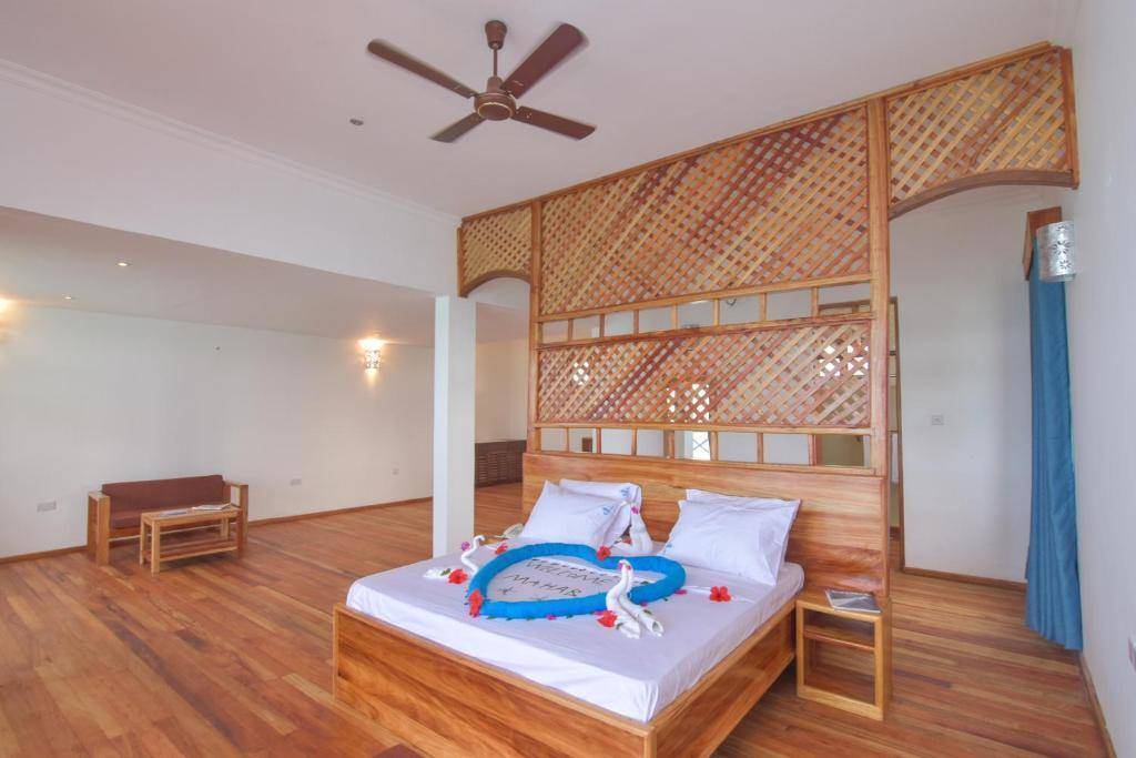 Certains logements offrent un lit à baldaquin en bois sculpté, un balcon avec vue sur la mer ou une kitchenette avec coin salon.