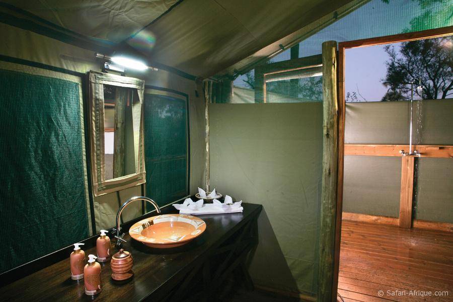 Le camp propose 16 tentes spacieuses avec salle de bain privative, installées sur des ponts surélevés.
