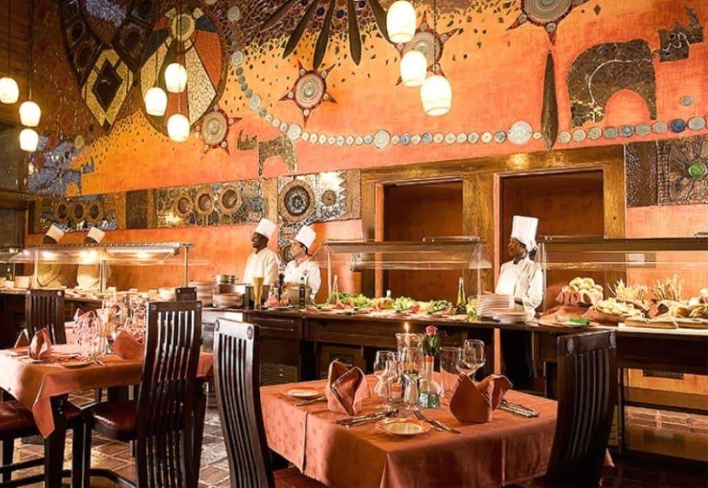 Le restaurant offre une vue panoramique sur les paysages environnants et propose une cuisine mêlant spécialités locales et continentales.