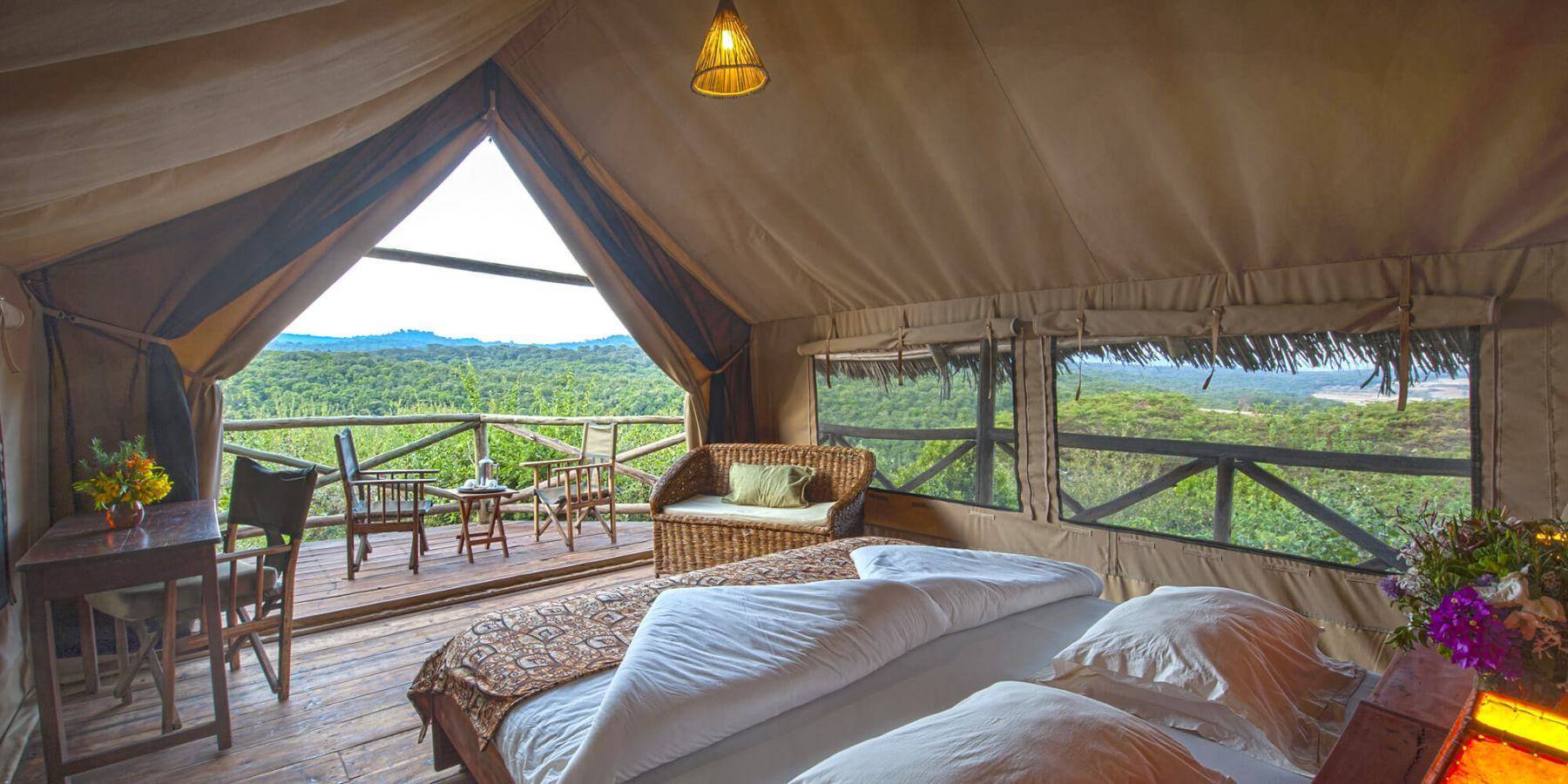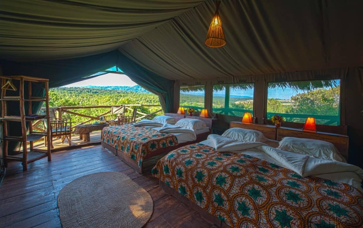 Chaque tente est équipée d’une salle de bain avec eau chaude et froide, et décorée dans un style africain traditionnel.