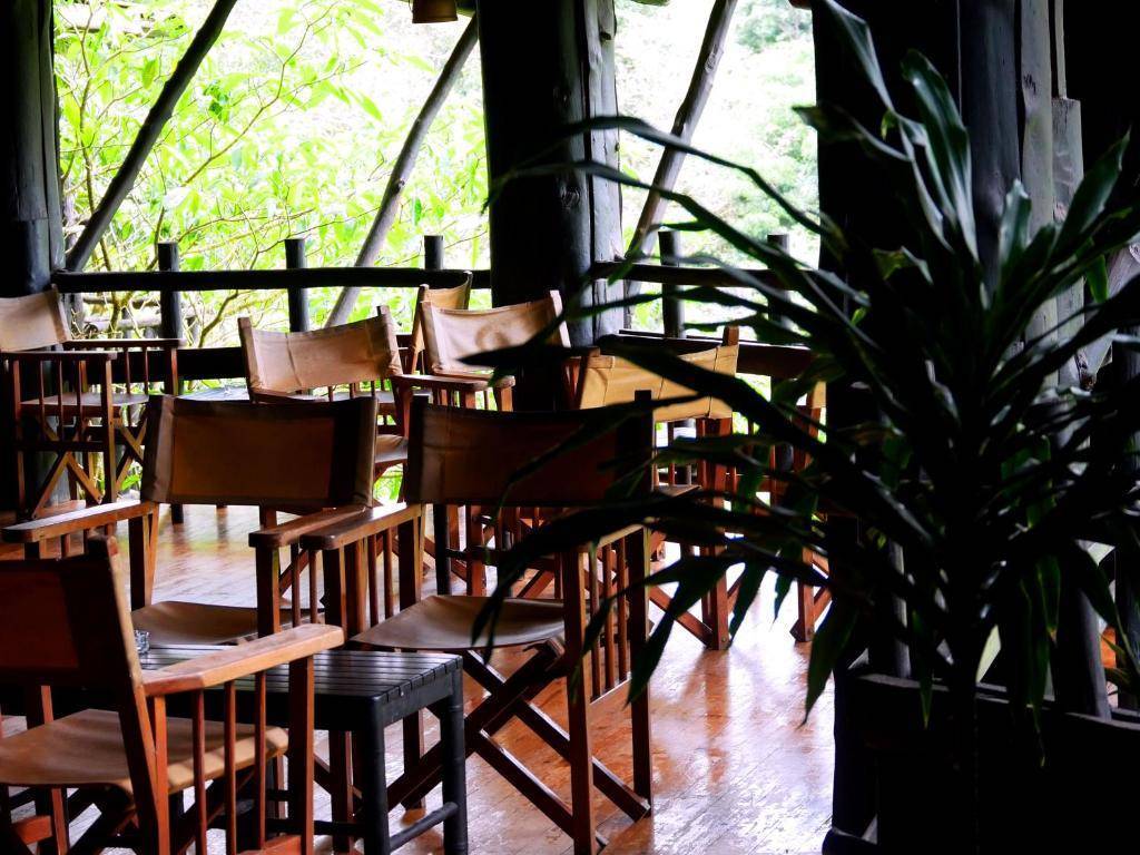 Les repas sont servis dans une salle à manger ouverte, sous forme de véranda, décorée de fresques inspirées de la vie primitive.