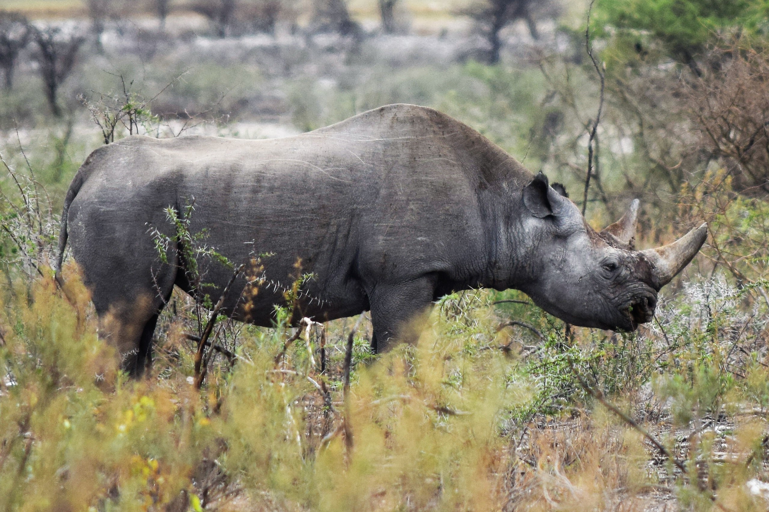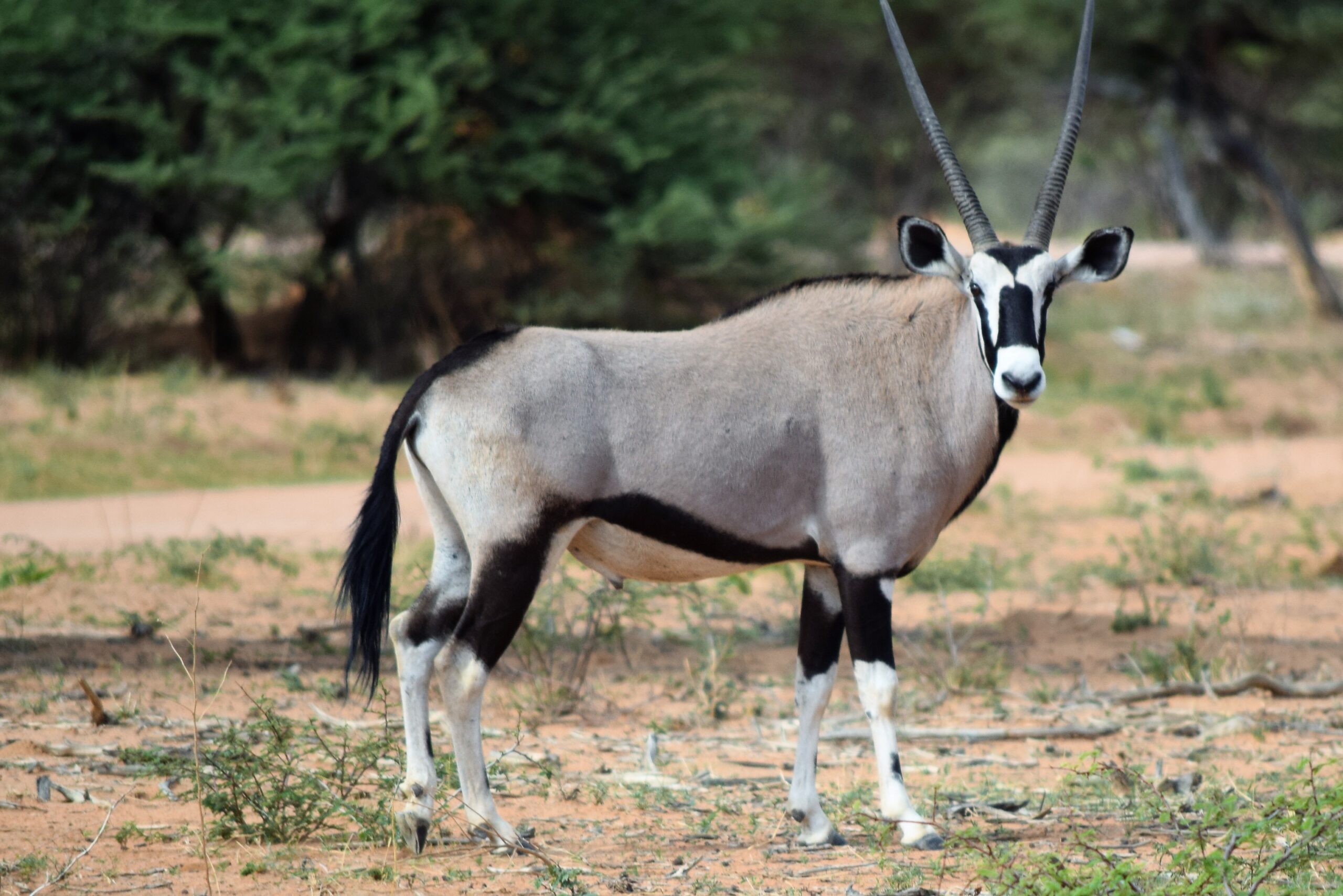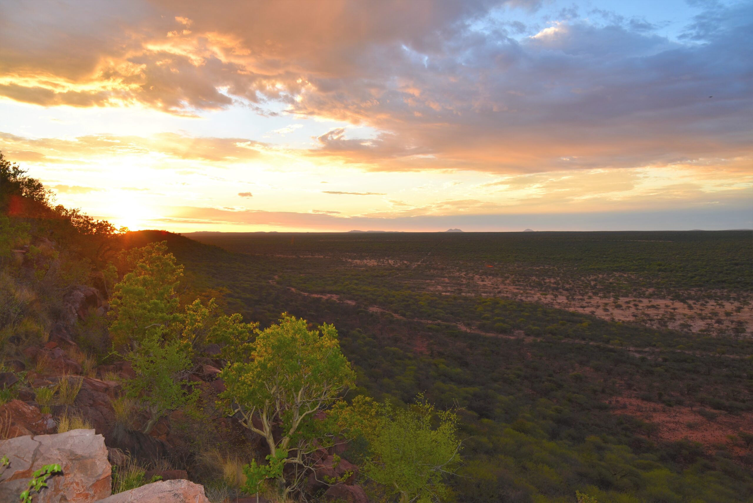Etosha, parc national à la faune abondante. En effet, ici vous pourrez observer une multitude d’espèces : zèbres, gazelles, éléphants, rhinocéros, lions, girafes, gnous, hyènes et parfois même les léopards. Il a une particularité : son changement d’aspect : à la saison humide, le lac se remplit d’eau (salée) et devient un point d’eau pour les animaux. À la saison sèche, le paysage devient sec et aride, donnant un aspect de désert de marais salant.