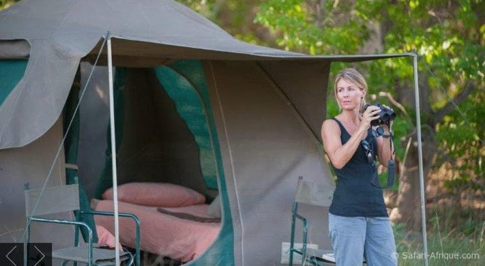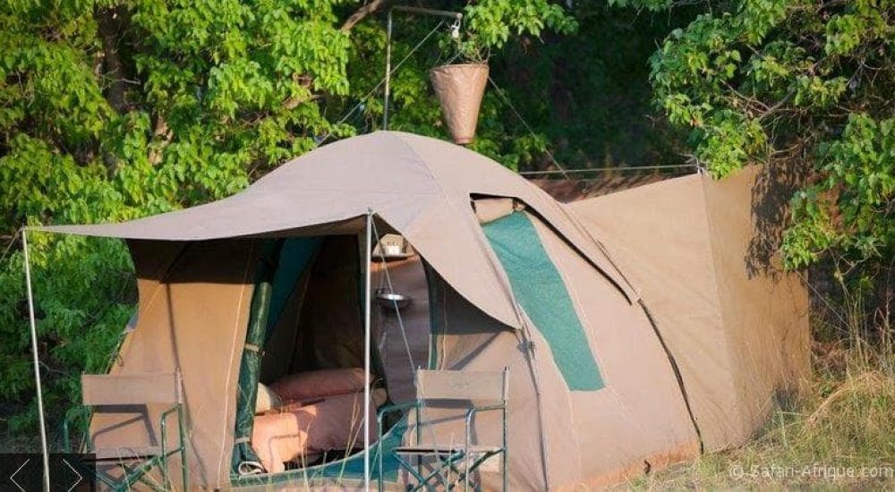 Hébergement (tentes spacieuses avec lits de camp et literie fournie, et salle de bains de brousse privée avec douche et toilettes),
